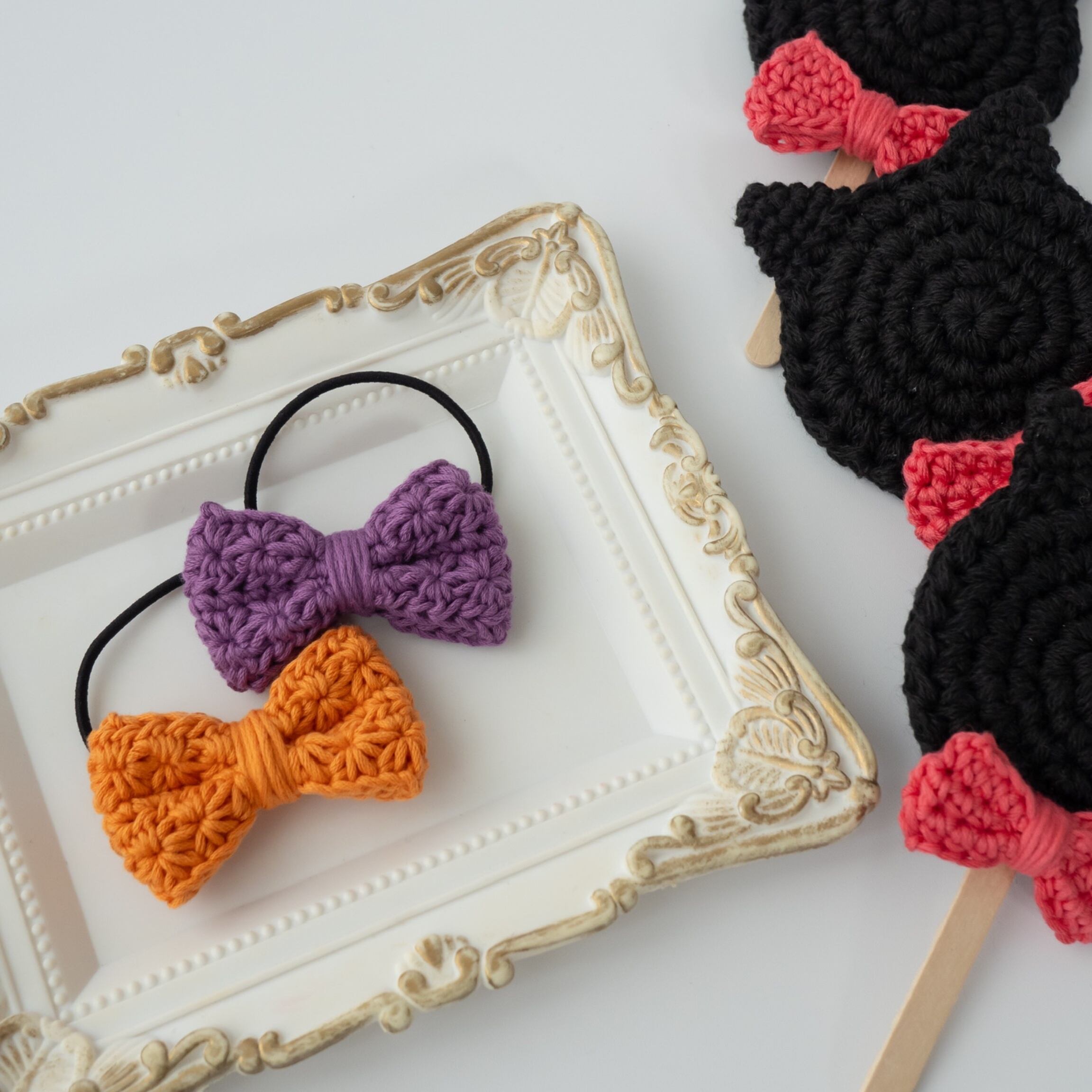 リボン ヘアゴム お花模様 ハロウィン 親子リンク ママコーデ 姉妹 キッズ ベビー 赤ちゃん 子ども 女の子 リンクコーデ 小学校 幼稚園 保育園 プレゼント カラフル ナチュラルカラー 淡色 パステルカラー かぎ針編み 編み物 コットン糸