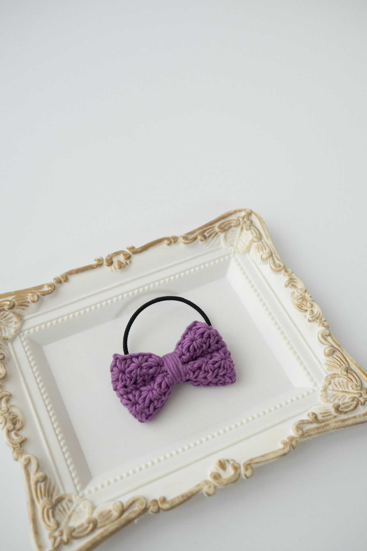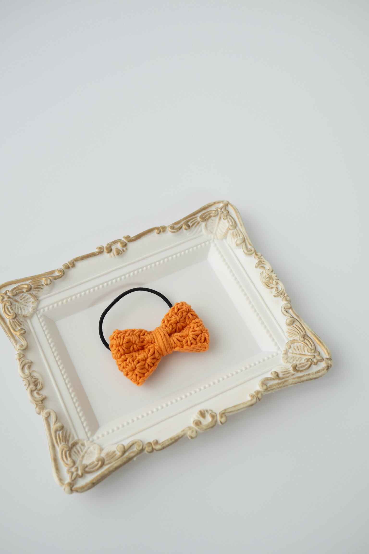 リボンモチーフのヘアゴムです。お花のような模様の出る編み方をしています。