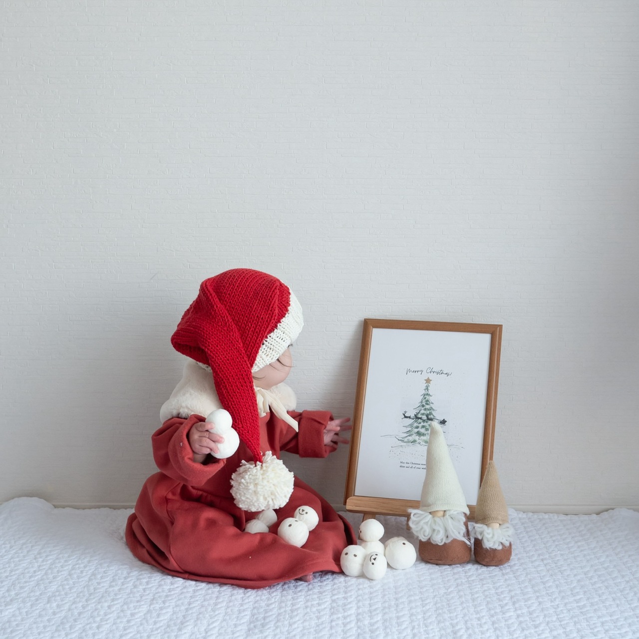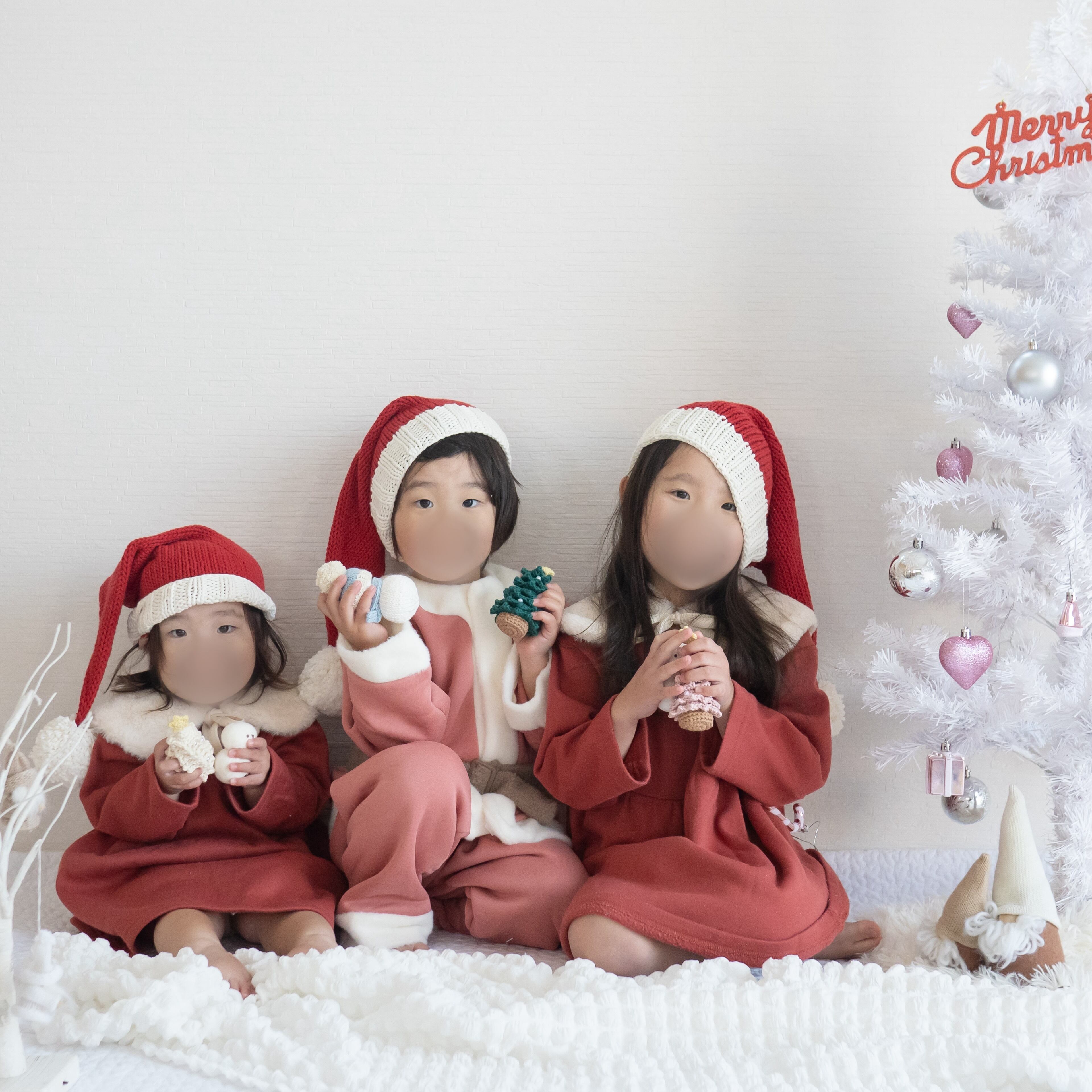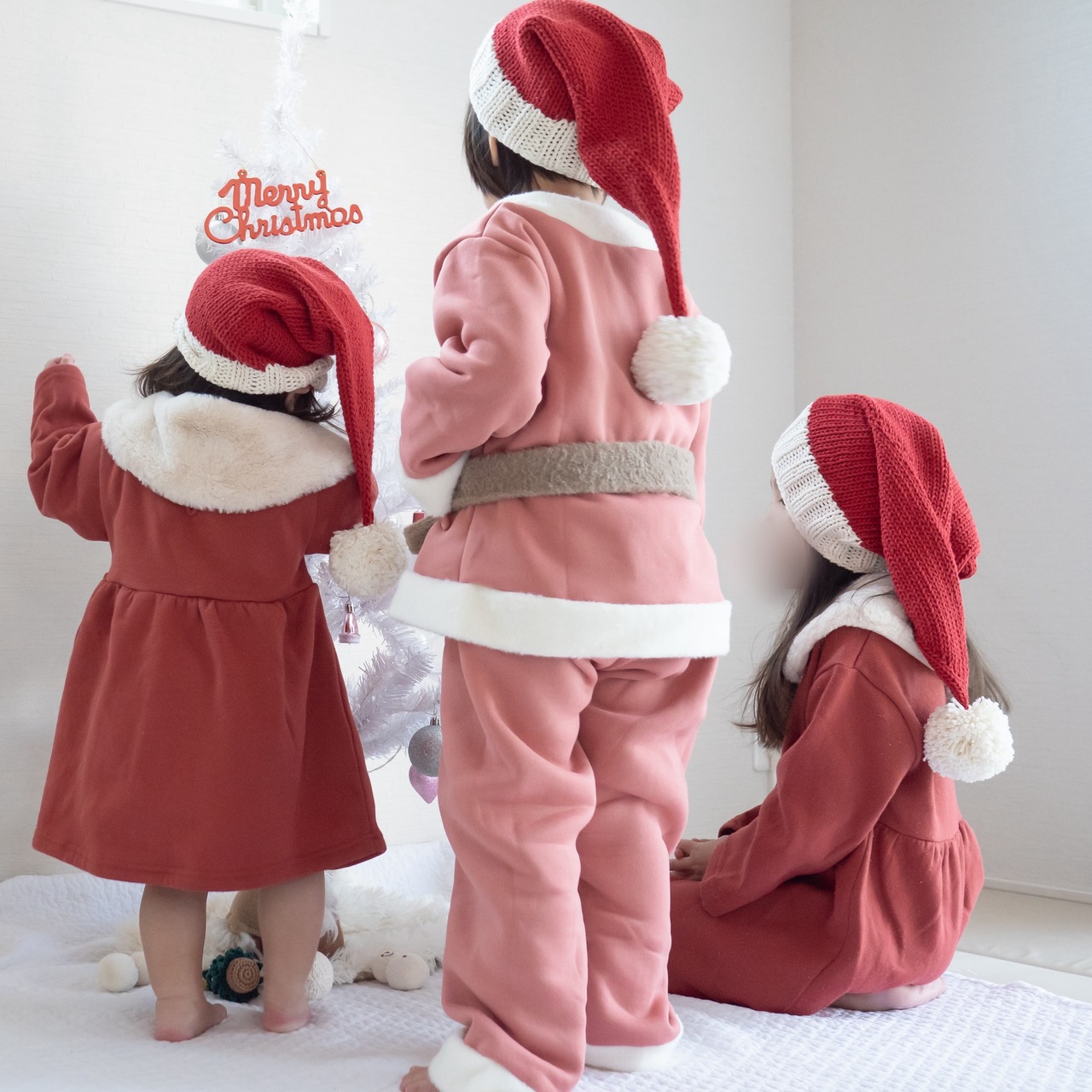 クリスマス パーティー サンタ帽 小人帽子 淡色 くすみ 棒針編み 編み物 キッズ ベビー 新生児 ニューボーン 赤ちゃん 子ども 撮影小物 おうちフォト ママコーデ 親子リンク 冬 コットン糸